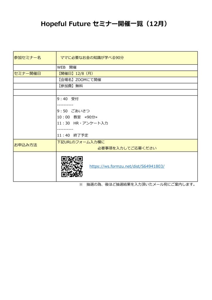 2025.11.21 保険・資産運用 2025年12月セミナー情報 お申し込みはQRコードまたはこちらからお申し込みください 投稿者: hopeful 保険・資産運用 2025年11月セミナー情報前の記事 キャッシュフロー経営講座 受講者からの推薦のことば次の記事